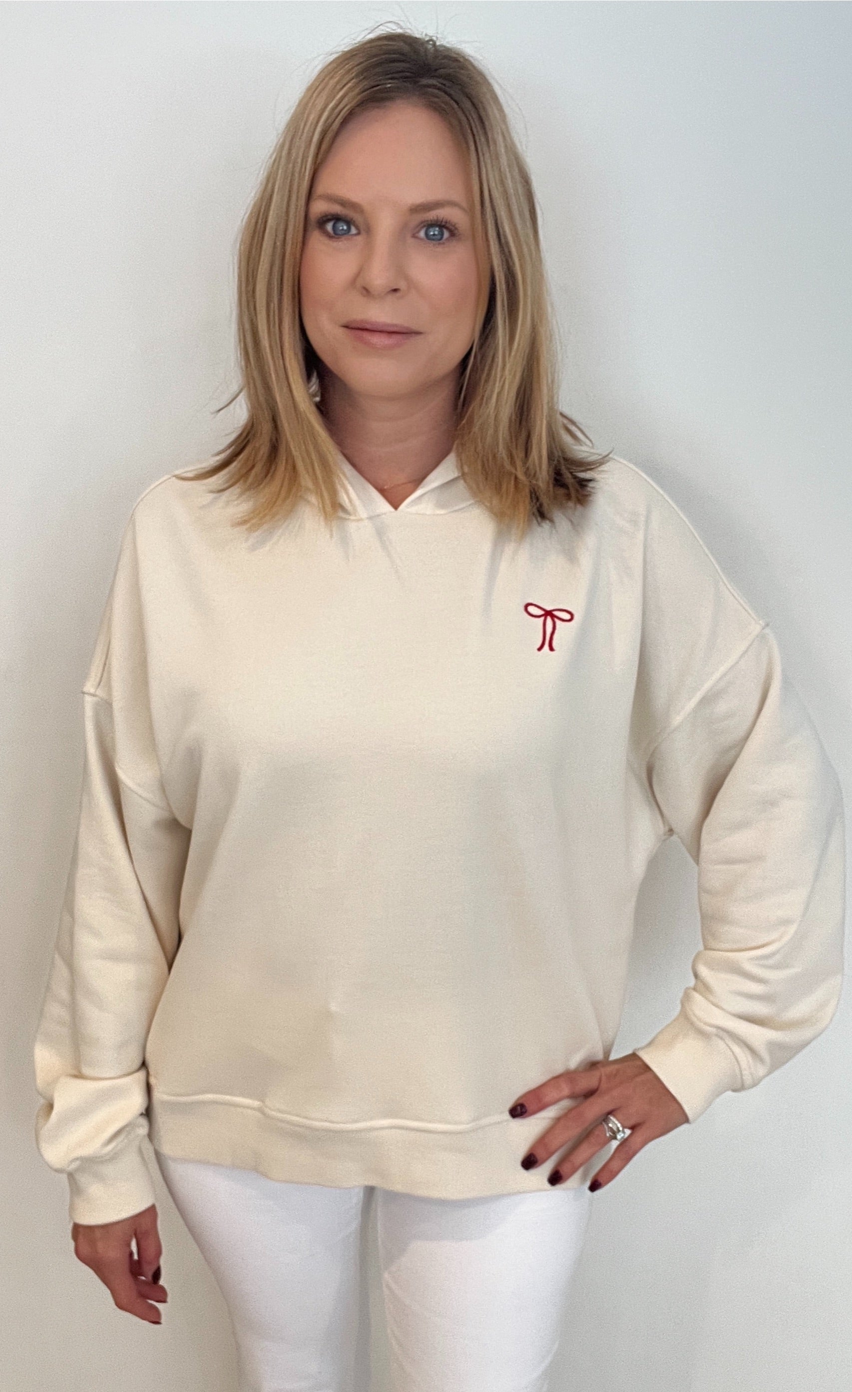 Our Bow Hoodie features a red embroidered bow, french terry cotton blend fabric, hooded and a relaxed fit.  Perfect for a casual holiday!  Fits true to size.  Model is wearing a size small
