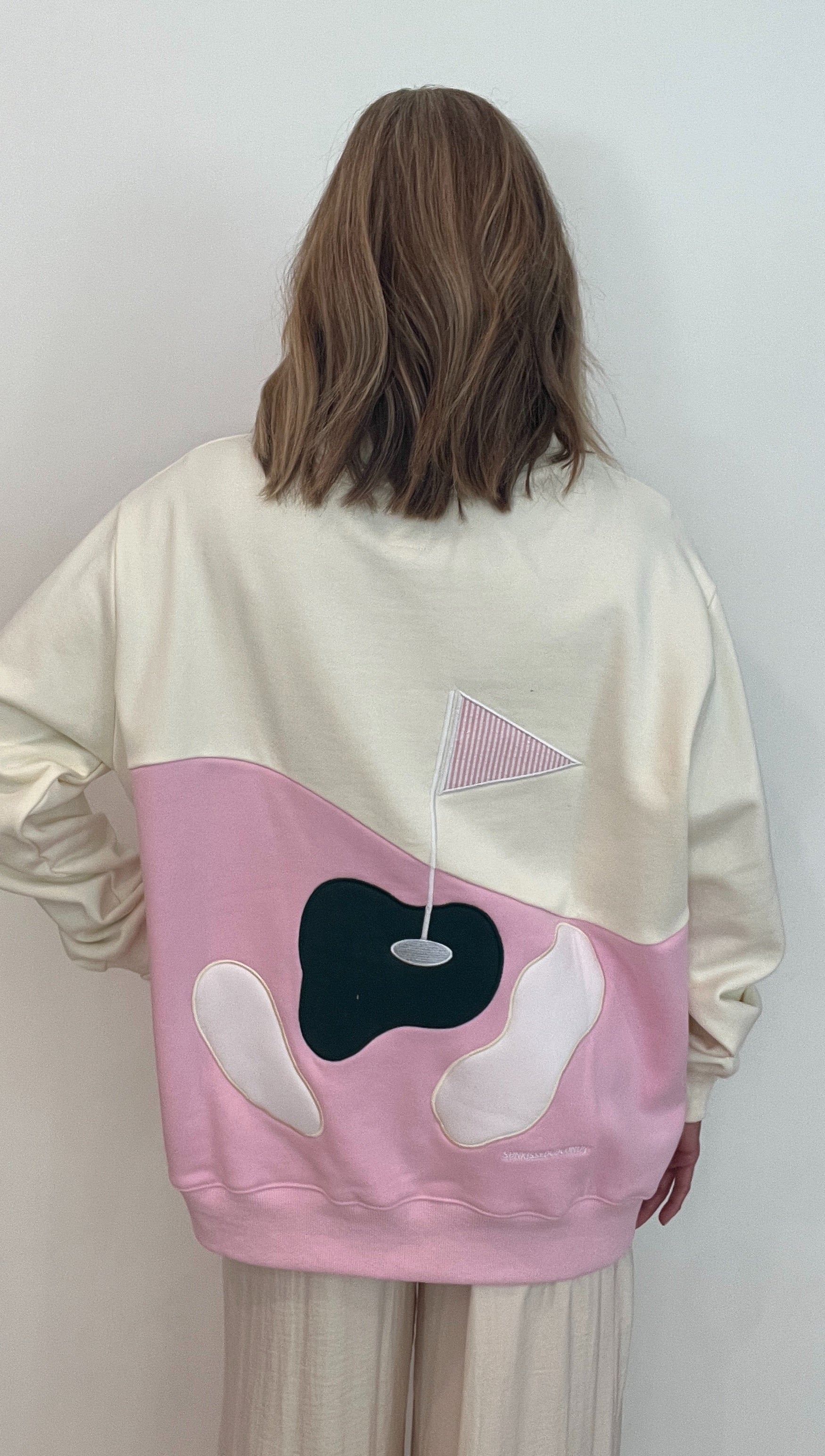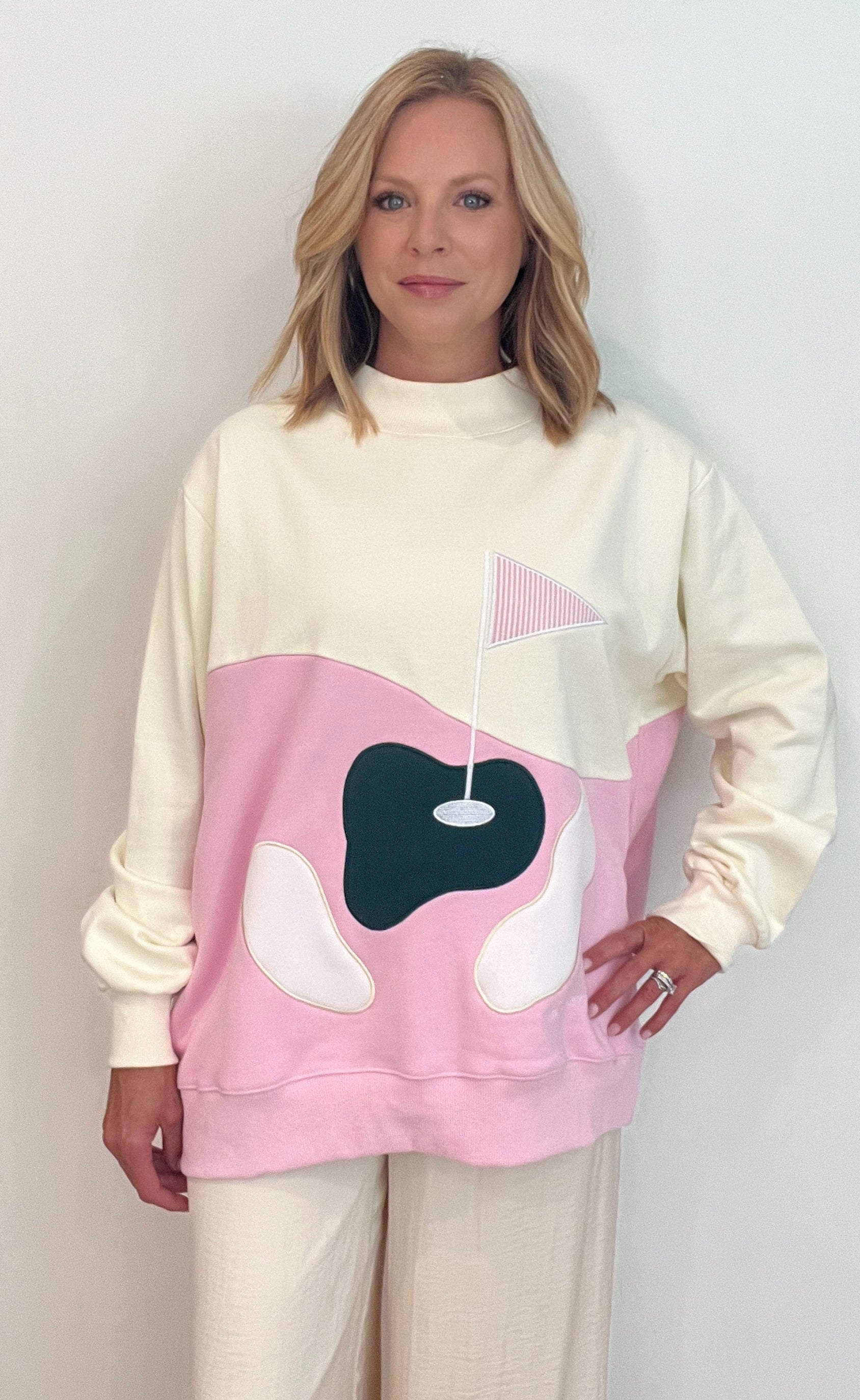 For the Golf lover! Our Tee Time Oversized Sweatshirt features a mock neck, 100% cotton, front and back flag, sand traps and putting green details. Runs oversized, size down. Model is wearing a size small