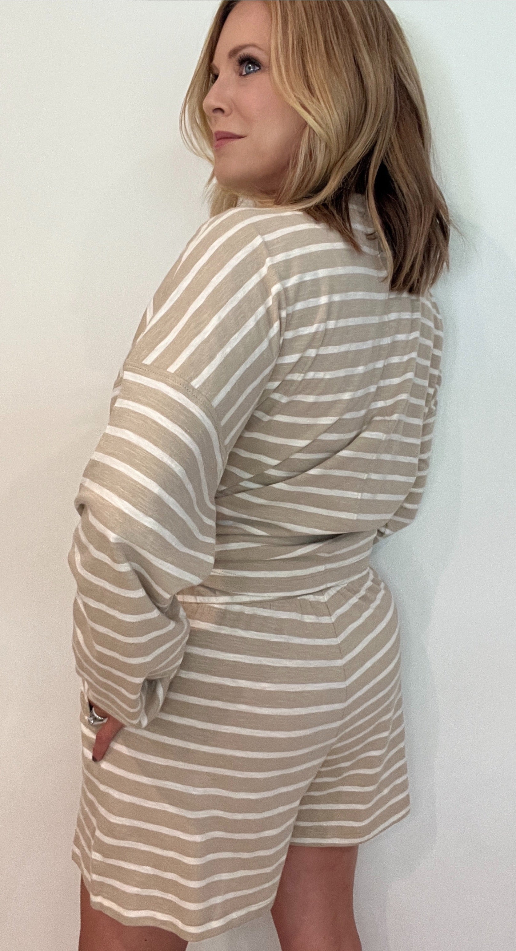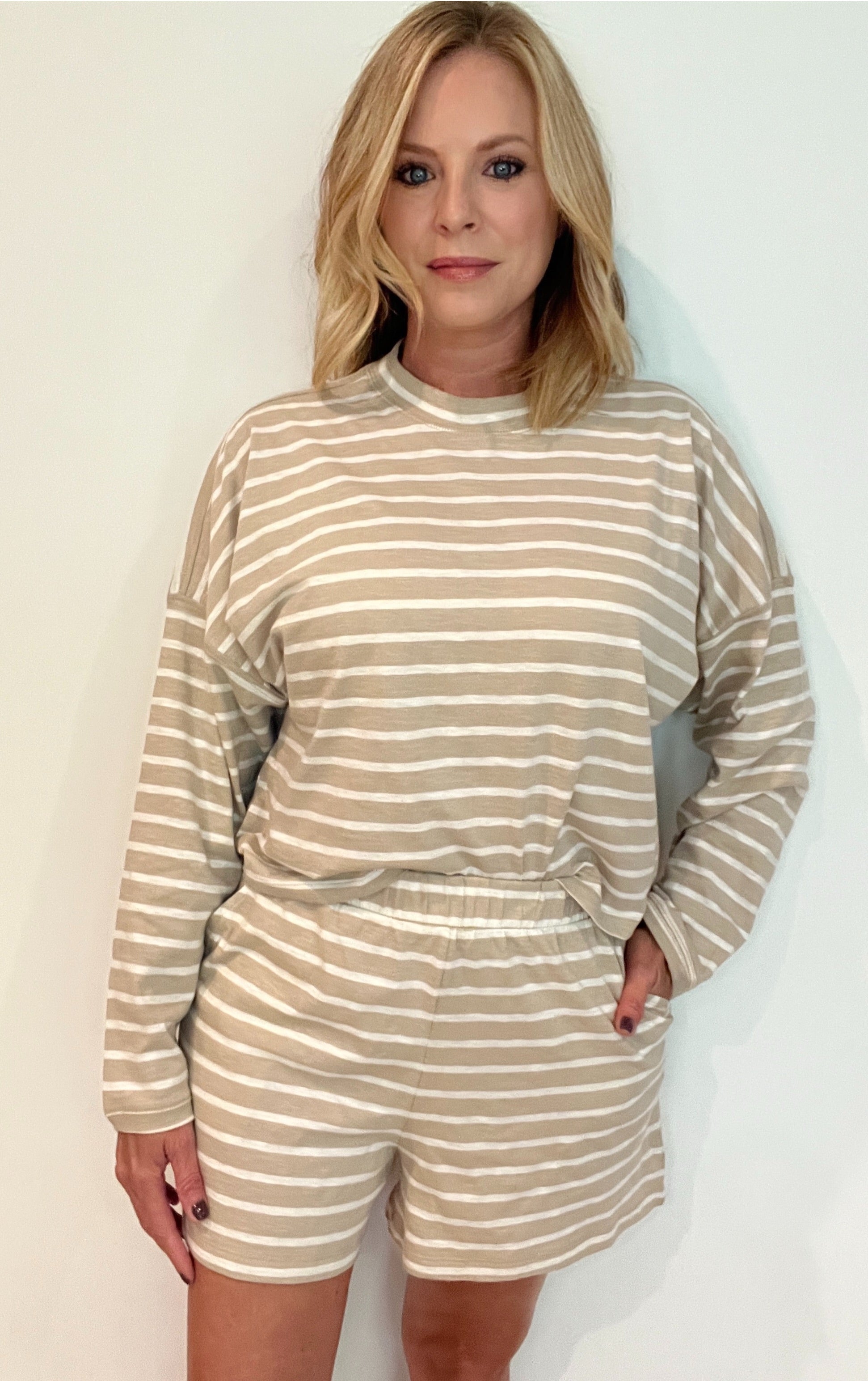 Our Autumn Sands Cotton Shorts feature 100% cotton, taupe/white stripe fabric, elastic waist and side pockets. Pair with Our Autumn Sands Cotton Tee for a matching set. Fits true to size. Model is wearing a size small.
