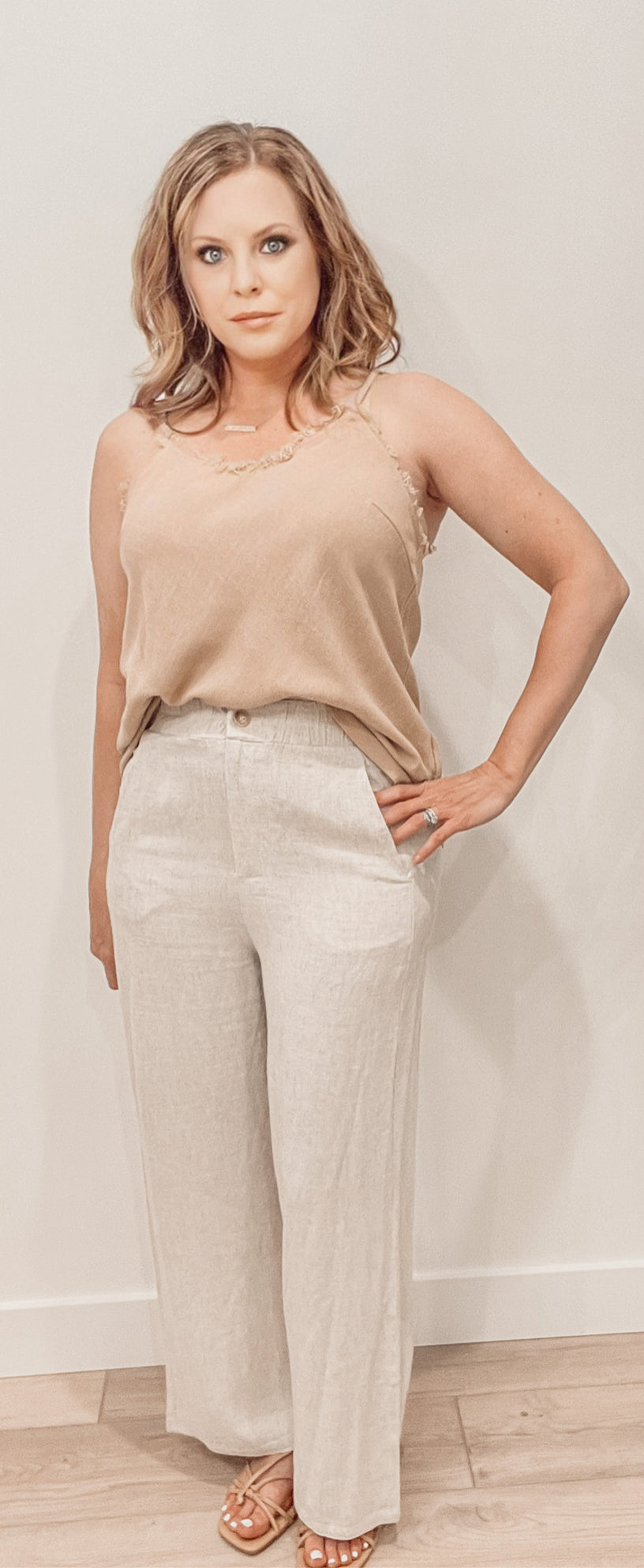 Our Dune Linen Pants are perfect for Spring and Summer!  Featuring a natural, woven linen fabric, elastic waistband with button and zipper closure, slightly cropped and pockets.  Wear with a lightweight sweater or tank top for warmer days!  Fits true to size (some size up for a looser fit).