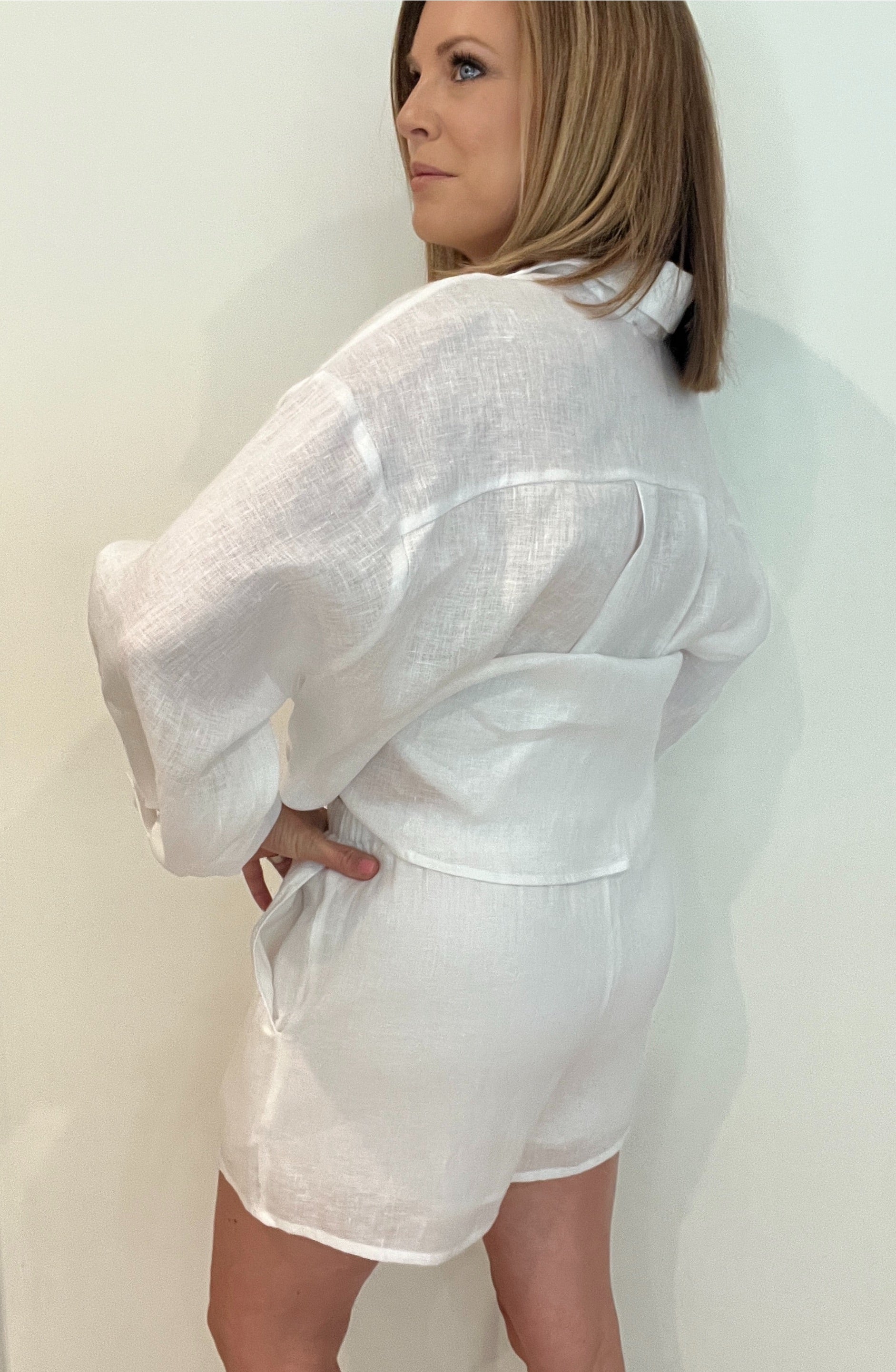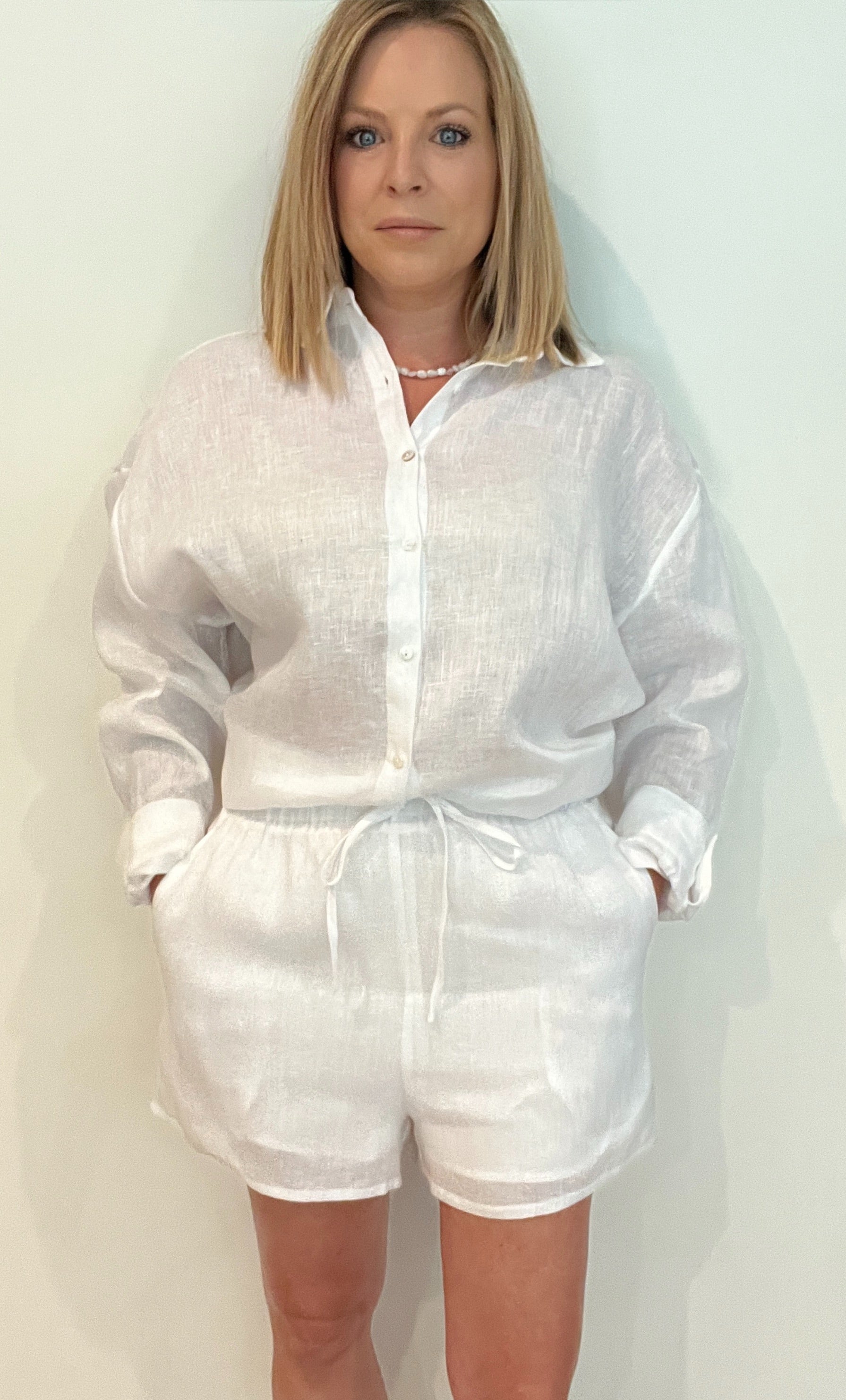 Our Offshore Linen Shorts feature 100% linen fabric, elastic waist with faux drawstring, side pockets and fully lined.  Pair with our Offshore Linen Button Down for a matching set.  Fits true to size, 2.5" inseam, model is wearing a size small.